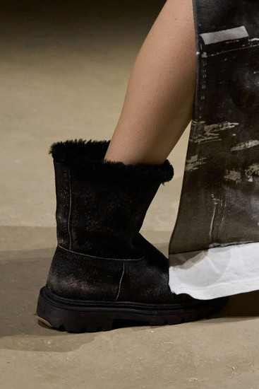 What Vevers has nailed again, is this uniquely American tension: heartland nostalgia wrapped in countercultural grit. A Stephen Shore photograph brought to life with a 70s-meets-90s twist. Upcycled black leather coats that could belong to a downtown goth, roughed-up denim that spoke of rebellion, scuffed boots stomping out any trace of gloss. And yet, preppy blazers in checks, biker jackets in raw tan suede, and an almost obsessive neatness on top before pants descended into glorious, slouchy chaos.