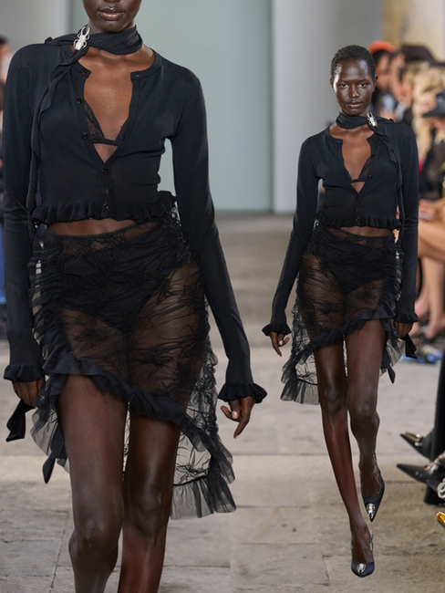 Under David Koma’s direction, Blumarine has traded its signature girlish charm for a more daring and nocturnal allure. The butterfly, once a fragile emblem of innocence, now emerges from its chrysalis with the intensity of a Gothic heroine, exuding a femme fatale aura. Koma’s vision fuses the softness of Blumarine with a shadowed, almost dangerous edge. Flirtatious innocence twists into intrigue, and the whimsical fairy becomes something sulfurous, seductive, and unignorable.