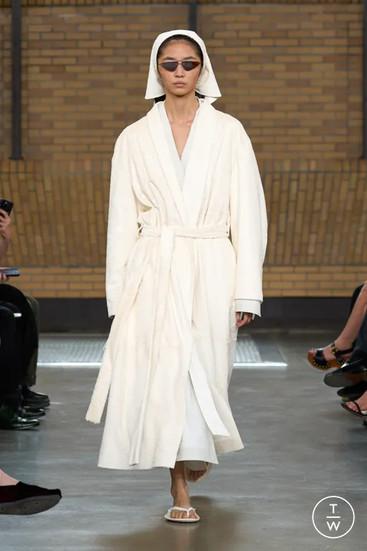 Calvin Klein has never needed cut-outs shaped like fireworks or graphics screaming in capital letters. Instead, this season, we saw how Leoni built tension through restraint. On one side of the spectrum came the fluid caftans, long calf-length dresses, and suits cut just oversized enough to look like you borrowed them from someone dangerously chic.