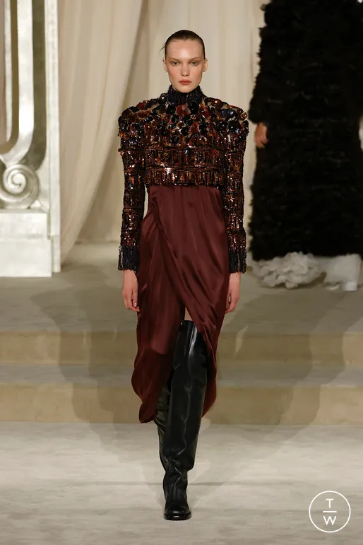 The models emerged from an ornate entrance as if summoned by the ghost of Mademoiselle herself. They wore tight buns, tall boots that left U-shaped indentations in the plush carpet clearly, even the floor had to feel the couture’s weight.