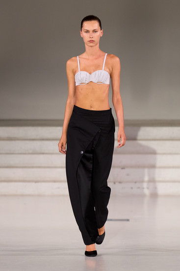 The collection introduced handkerchief skirts in multiple variations, cut-out shoulders on dresses and tops, and draped trousers that evoke the ease of skirts. Ascot collars and extended cuffs elongated silhouettes, while fused strips on hems added subtle sculptural relief.