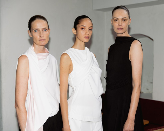 Key looks included a white crepe opening dress with a cowl front drape and satin teardrop insert, a black handkerchief dress with a signature 360° neck and waist drape detailed with a half Martingale belt, and a square-neck loose-fit dress with a flared draped skirt.