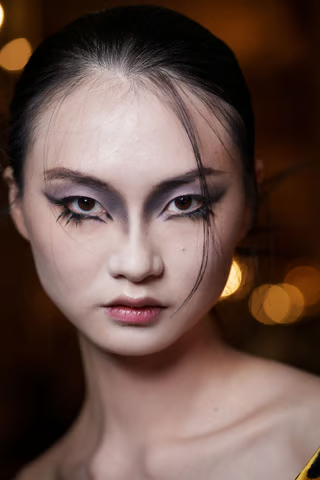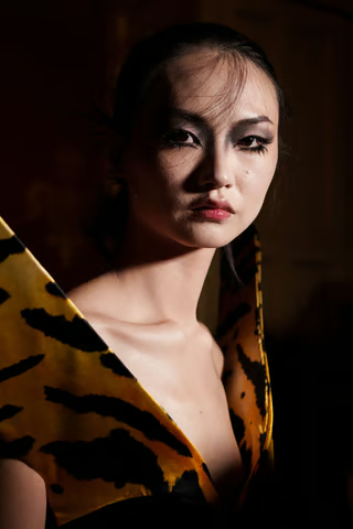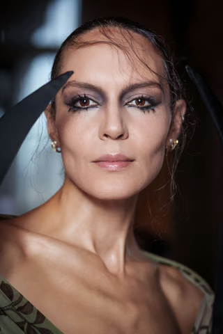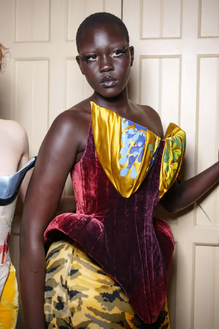 Reed’s well-established corset program was very much alive. One look stood to attention like a human paper doll, encircled by a dense halo of black feathers, equal parts Gothic and absurd. Another gilded floral bustier melted into a devoré velvet skirt in a poisonous shade of acid yellow spinal print. It was the kind of garment that demands silence in the room, or at least an appreciative gasp, followed by “how on earth do you sit in that?”