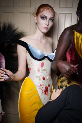 The caged silhouettes, which have become shorthand for Reed’s brand of maximalism, were refined here. They felt less like showpieces for Tate Britain and more like relics meant for private collections or, in one customer’s case, to be displayed above the pastries in her kitchen. Yes, really. That’s the kind of clientele Reed has cultivated: part gala circuit, part eccentric collector.