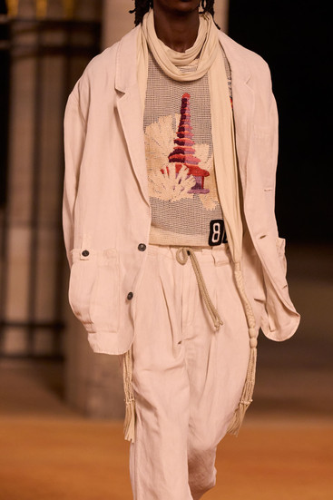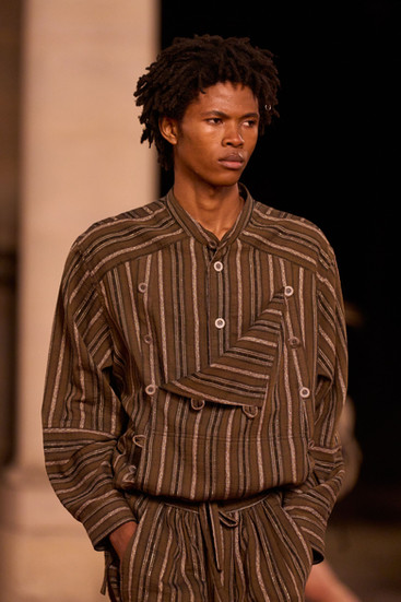 Each garment looked like it had lived a life, yet somehow still smelled of Parisian perfume. Her men’s pieces, meanwhile, nodded to the early ’80s: roomy jackets, slouchy trousers, and Berber-striped tunics that felt both effortless and nostalgic.