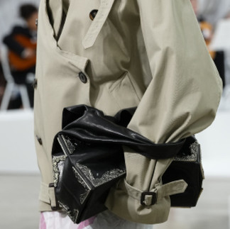 The collection balanced austerity with street-level relevance: minimalist-gothic long black leather coats, dirty denim outerwear, and trailing tape-ties that recall early Maison Margiela signatures. “My ambition has reconnected to the reality of the street a bit, and that was something we discussed here in the beginning,” Martens said.