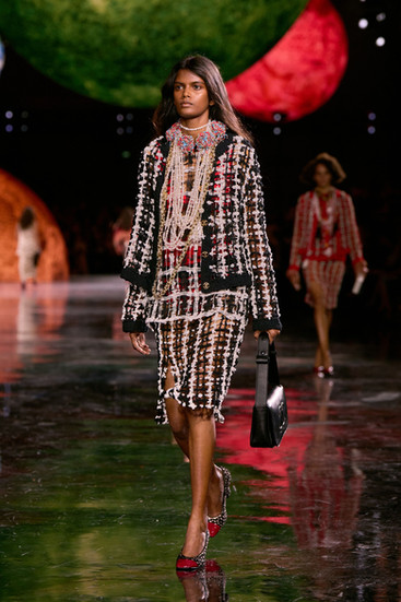 At long last, the moment the fashion world had been holding its breath for finally arrived. After ten months of whispers, expectations, and the occasional dramatic headline, Matthieu Blazy took over the Grand Palais for his first Chanel collection. The setting was nothing short of cosmic: floating planetary orbs glowing above the crowd, as if Coco herself were watching from a star. It was precisely eight o’clock or, more realistically, a fashionable few minutes past, when the lights dimmed and the audience, now completely still, faced the monumental question: what would Blazy do with Chanel?