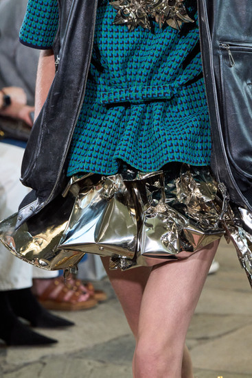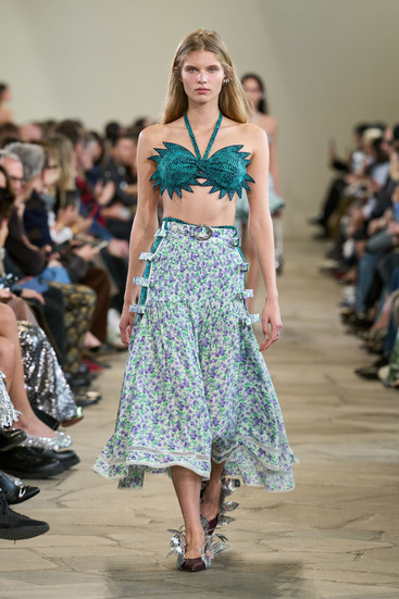 Metallics came in the form of crushed chrome skirts, conceptual leis, and sequined panels that caught every flash of light. It was less “space odyssey,” more “beach disco at the end of the world.”