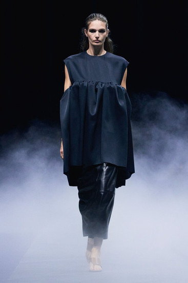 The season thrived on contrasts. Padded shoulders on tie-neck silk blouses met almost childish embroideries on button-ups, while Basque-waisted pinafore tops and double-breasted coat dresses contrasted sharply with raw, deeply cuffed denim reminiscent of grade-school styles from decades past.