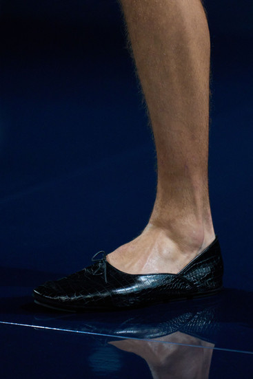 Patent leather pieces were laser-cut with slits so fine they looked as if they had been kissed by saltwater.