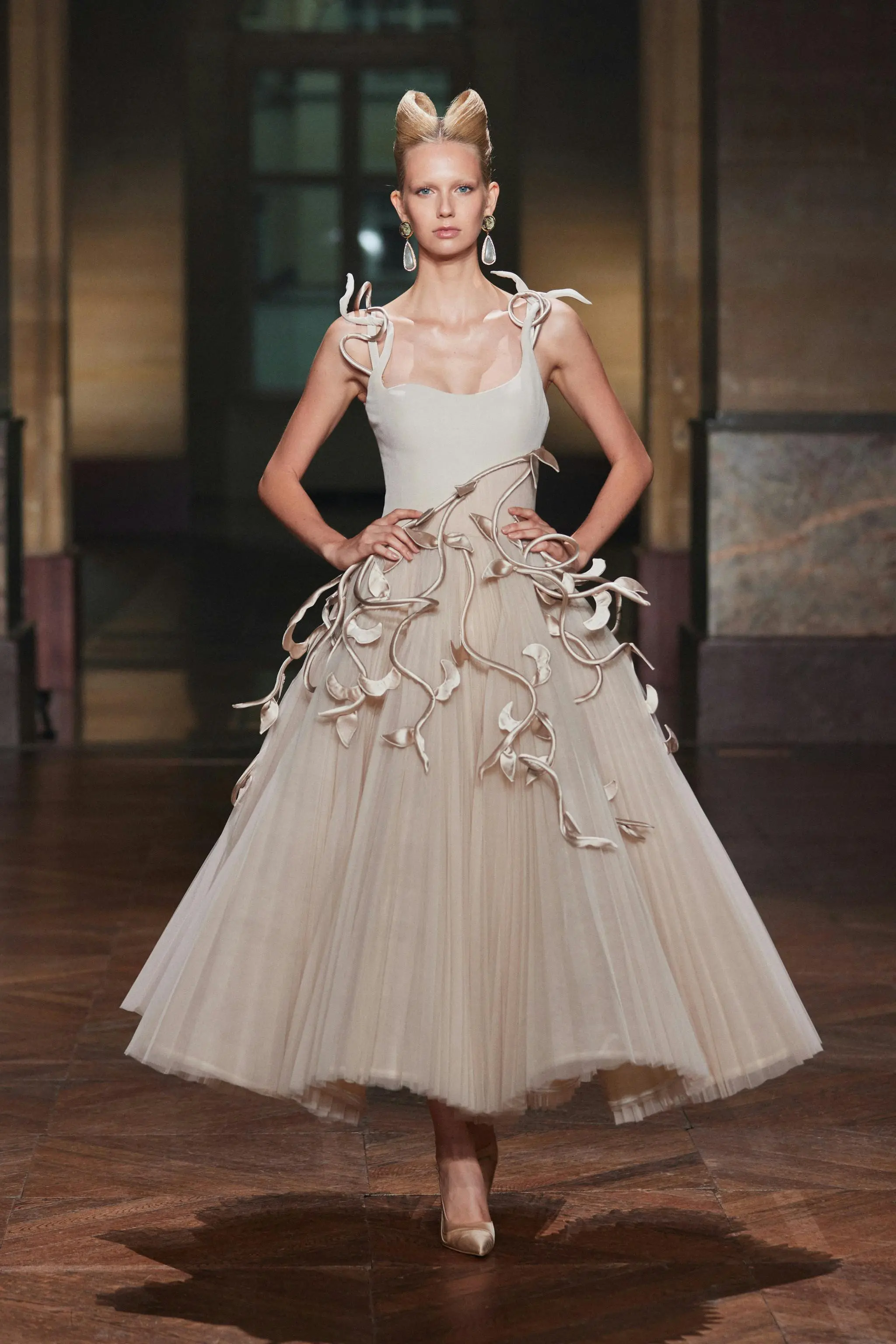 The collection was an ode to the very act of making. Every stitch felt like a meditation, every embroidery like a litany. Draping was mastered to the point of invisibility, proving once again that true technique is not seen but felt. The interplay of laser-cutting with hand embroidery, the balance of ancient savoir-faire with technological precision, all spoke of a house deeply aware of its heritage but unafraid to experiment.