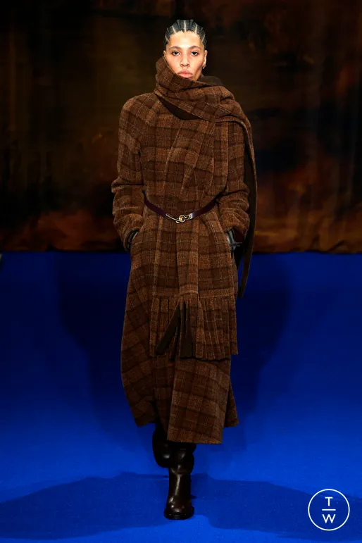 La palette de couleurs hivernale mêlait bruns profonds, prune, beige, avec des touches de blanc et d’or. L’outerwear était au cœur de la collection, conjuguant inspirations countryside et élégance britannique, avec une touche de chic à l’italienne dans la fluidité et le raffinement des accessoires.