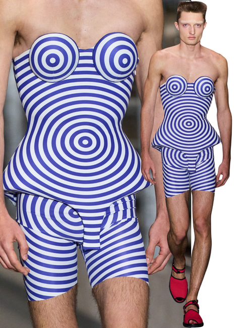 The iconic marinière stripes reappeared, not as sailor shirts but as optical illusions wrapped around wired mini-dresses, each with a sinuous S-shaped curve that distorted and exaggerated the body’s natural lines. It was as if Gaultier’s archives had been fed through an algorithm trained on late-night techno clubs and queer fantasy.