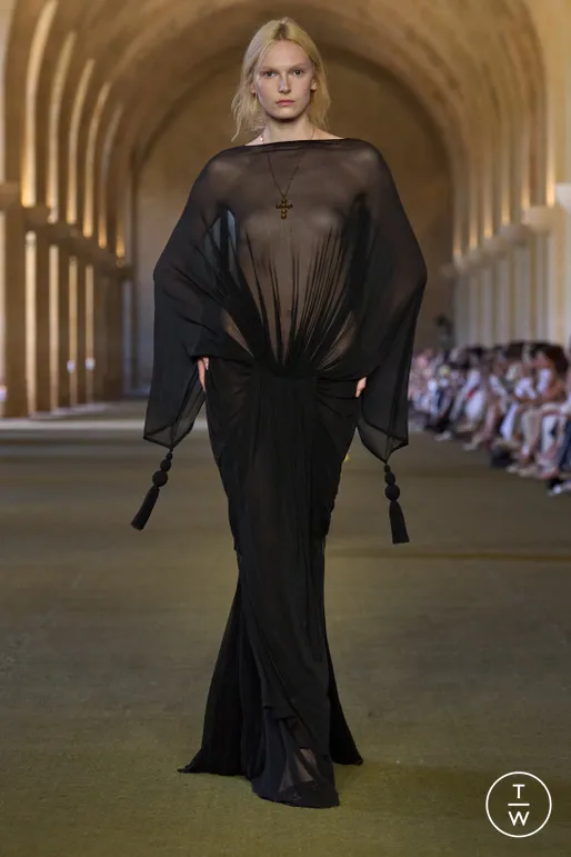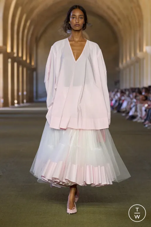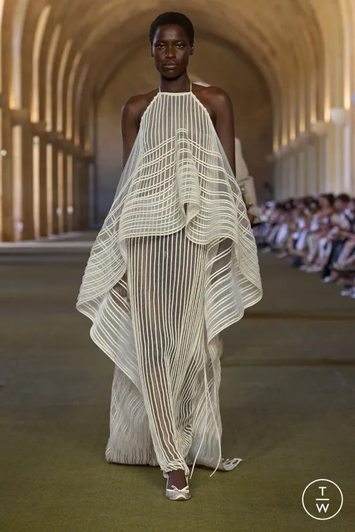 Le show a débuté par un moment cinématographique : un enfant pieds nus, vêtu de blanc, courant dans le hall baigné de soleil et ouvrant les imposantes portes en bois pour annoncer le début du défilé. Ce geste poignant symbolisait le parcours du créateur, de ses modestes débuts à la grandeur de Versailles, fusionnant passé et présent en une seule image puissante. Et puis, Loli Bahia ouvrit le bal.