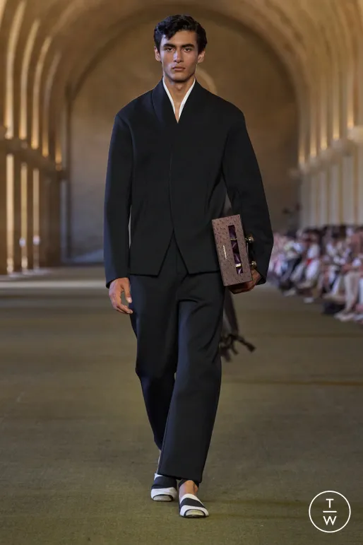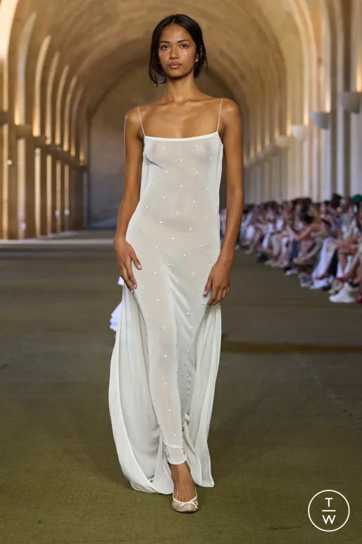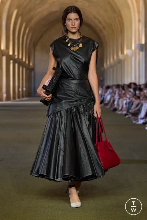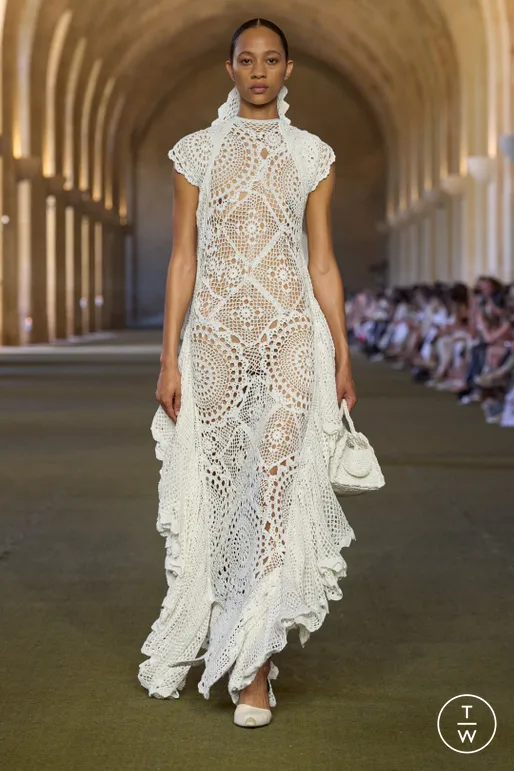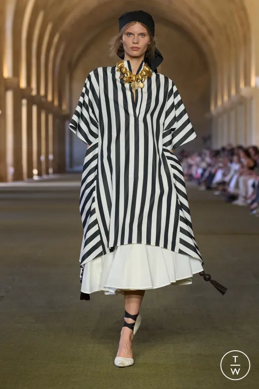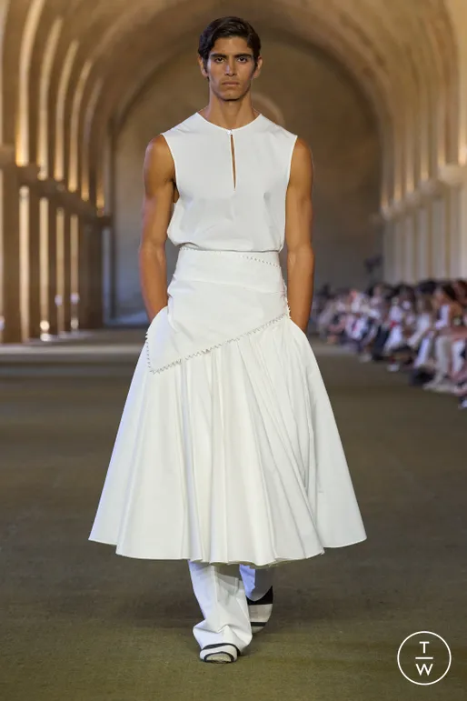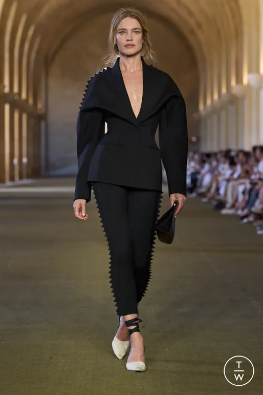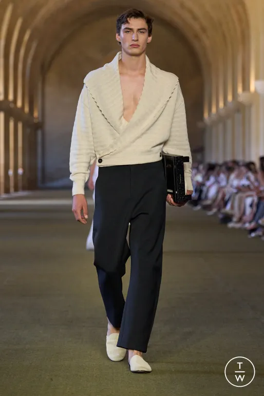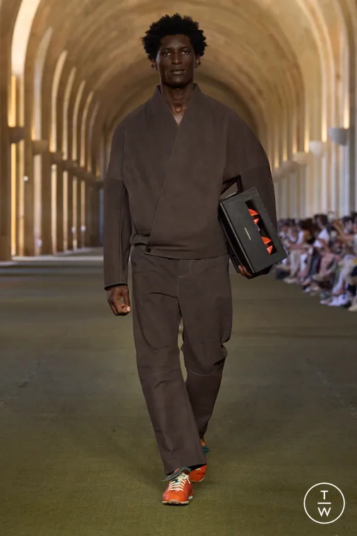 La connexion du lieu avec les orangers de Louis XIV ajoutait une dimension supplémentaire au défilé, en accord avec les thèmes de nature et d’héritage de la collection. L’interaction de la lumière à travers les arches de l’Orangerie projetait une lueur chaude sur les modèles, accentuant l’élégance rustique des pièces.