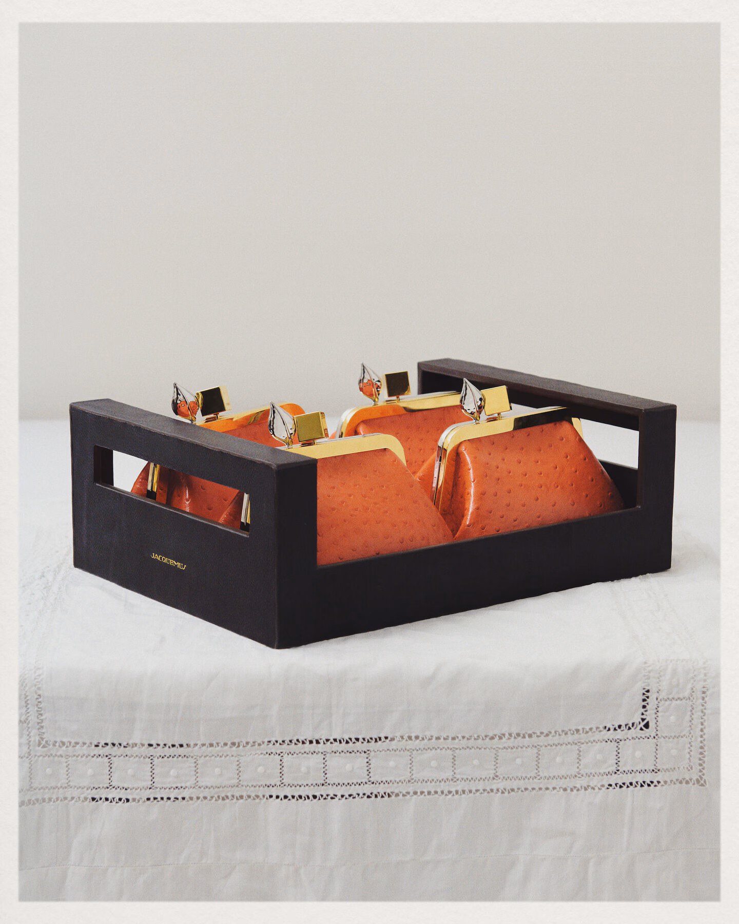 Les accessoires de Le Paysan étaient à la fois pratiques et stylés, reflétant le quotidien rural tout en portant la signature de Jacquemus. Les paniers de marché, traditionnellement utilisés pour la récolte, ont été réinventés en cuir, apportant une touche chic à un objet classique.