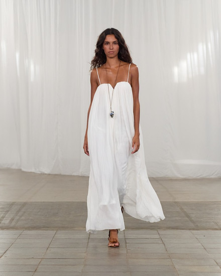 Chaque teinte est effleurée de reflets dorés, reflétant l’énergie lumineuse de la saison. Les tissus sont choisis pour leur légèreté et leur élégance. Les satins luxueux scintillent comme l’eau baignée de soleil, les cotons biologiques respirent sans effort, et les chiffons délicats flottent à chaque pas, incarnant la nature éphémère et fluide de l’été.